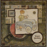 No work today, so sat down to do the Tuesday Morning Sketch Challenge, I followed the sketch and used a image from Digi Doodles (the latest digi company I have discovered), their images are fantastic, I coloured this Boy and Vintage Tractor image with my copics, DP is BG Archaic. This card was great fun to create, I did all the things I normally try not to do! I srunched up the image after colouring then scrunched up all the papers, distressed all edges and stapled around the DP, a can thingy with a pull tab that I have had forever and a few brads later and I was done. I am also entering this in the Thursday Taggers Challenge - Texture (I think the metal can thingy with pull tab qualifies)